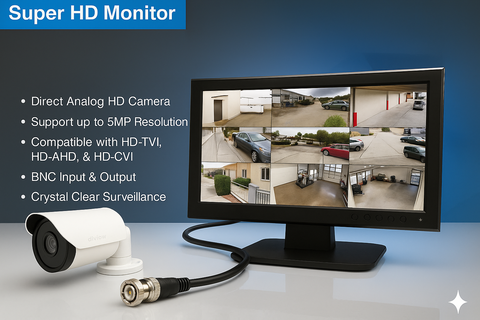 - 23.6" Super HD MT-G236HD 5MP/2592x1944 over Coax LED Security Monitor. 1 HDMI & 2 Super HD BNC (Analog) Video Inputs. BNC video-in port works directly with the new Super HD security cameras without going through any DVR or converters. It will allow security cameras send clear video by using a single Coax cable to the HD monitor, and it can prevent fuzzy or unclear images between the camera, recorder, and monitor. And 2 BNC (Analog) Video Outputs for Second Monitor. Comprehensive range of Super High Definition product line, including cameras, DVRs/NVRs, and Super HD monitors.
